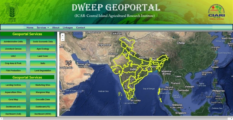 | ICAR-Central Island Agricultural Research Institute has initiated to develop dedicated Dweep Geoportal to systematically organize and deploy agriculture and allied information in Geographic Information System (GIS). The user interface of dweep Geo-portal was developed using web technologies i.e. HTML, CSS and JavaScript to visualize various point, line and polygon thematic layers on administrative layers (District Boundary, Block Boundary, Socio Economic Data, Demographic information, Land use land cover, Natural resources: Soils, water, etc., Climate and weather, Watershed map, Crop, Livestock and Fisheries data. Spatial layers on Island resources were deployed and provided as Web Mapping Services (WMS) by using the Geoserver platform By hosting GeoServer on Tomcat Web Server. Open Layers, a free mapping library, is integrated into GeoServer to display variety of maps to the user. These layers were stored in PostgreSQL database. All open source Web-GIS tools GeoServer, PostgreSQL and OpenLayers were installed in the local server. |