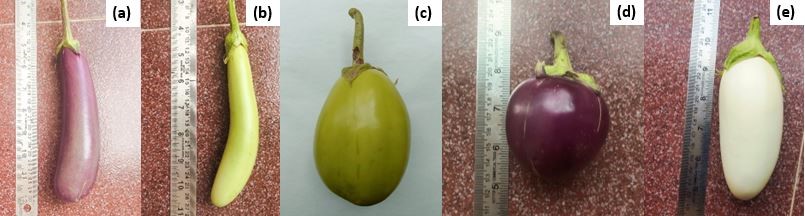 Brinjal varieties tested in ICAR-CIARI Regional station, Minicoy (a) Pusa purple long, (b) IIHR green long, (c) CIARI brinjal 1, (d) Hybrid purple round, (e) Farmer Variety from Minicoy