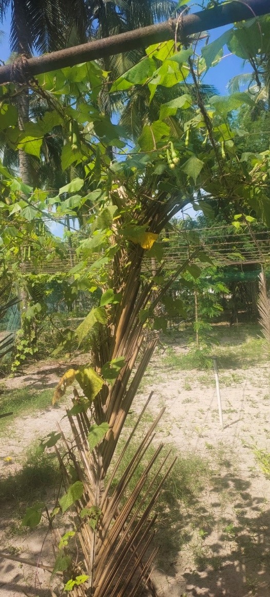 The domestic garden of Minicoy usually recognised with scarlet gourd, sponge gourd, chilli and brinjal. As a new candidate, ICAR- CIARI Regional station Minicoy introduced Clove bean, as vegetable as well as ornamental vine to the home garden of Minicoy Island. The seeds of Farmer’s variety of Clove bean “Nithya vazhuthana” brought from Kerala and tested in demonstration field of the Institute. An area of 4 Sq.m, with “Pandal” was used for the cultivation. The pits were made with the dimension of 60X60X100 cm and filled with poultry manure of 2 kg/ pit.Single seedling were planted in each pit of distance 50 cm apart. The yield and other characteristics of the variety given in table. The variety performed well in the field of Minicoy, Lakshadweep with yield of 0.75 kg/ Sq.m./ week.