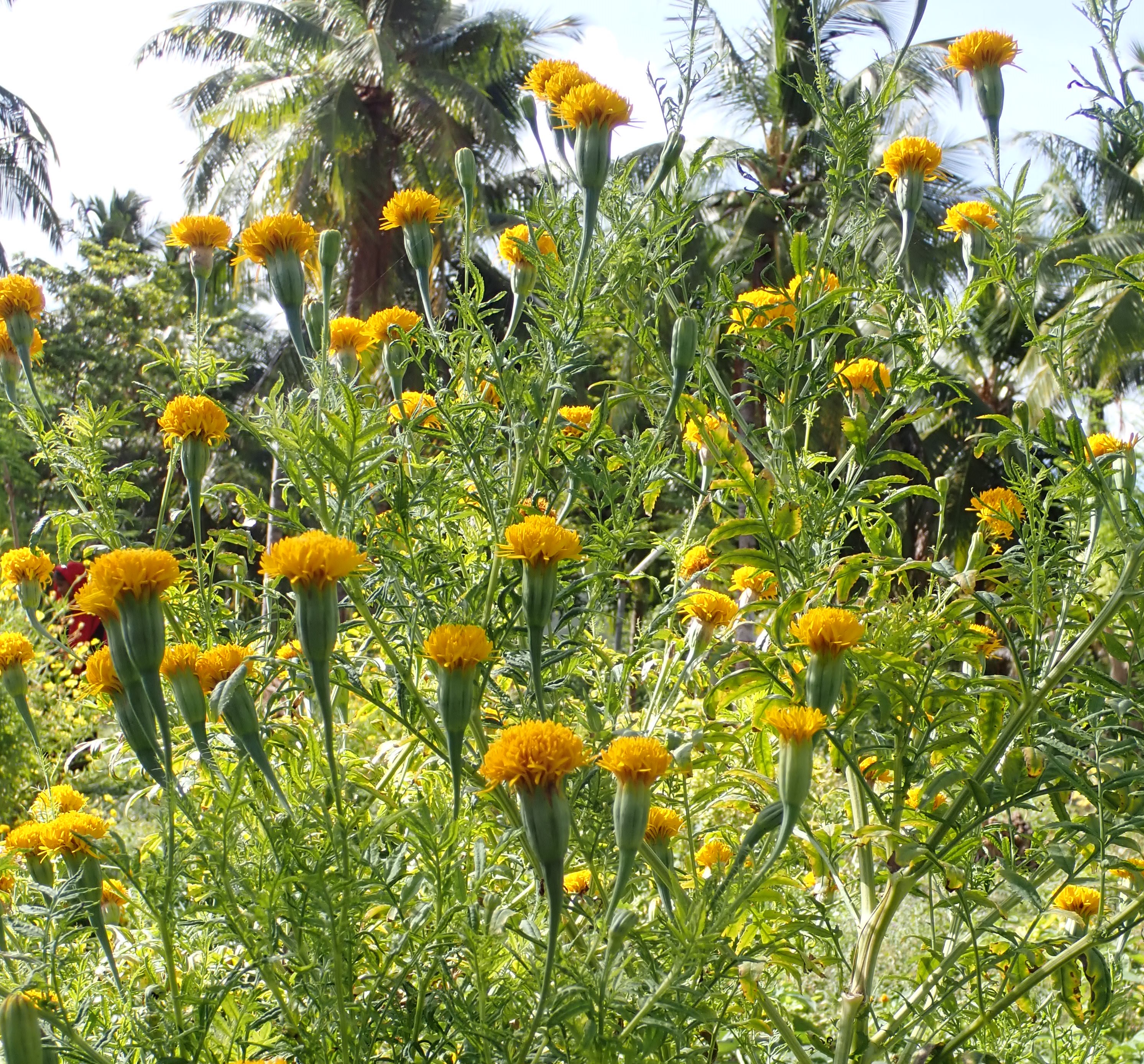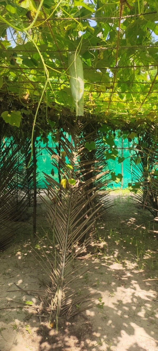 Sponge gourd cultivation under coconut plantation :Sponge gourd is locally known as “Bodutholi” a highly preferred vegetable crop of Minicoy. The seeds of farmer’s variety of sponge gourd were collected from village and tested in field of ICAR- CIARI, Minicoy. An area of 10 Sq.m., with “Pandal” u were made for the cultivation. Two rows of 7.5 m distance with 5 pits each of dimension 60X60X100 cm were made. The pits were filled with poultry manure of 2kg/ pit, and planted two seedlings in each. The variety, was found to be resistant to the pumpkin beetle and performed well. The yield per Sq.m was 0.8 kg.