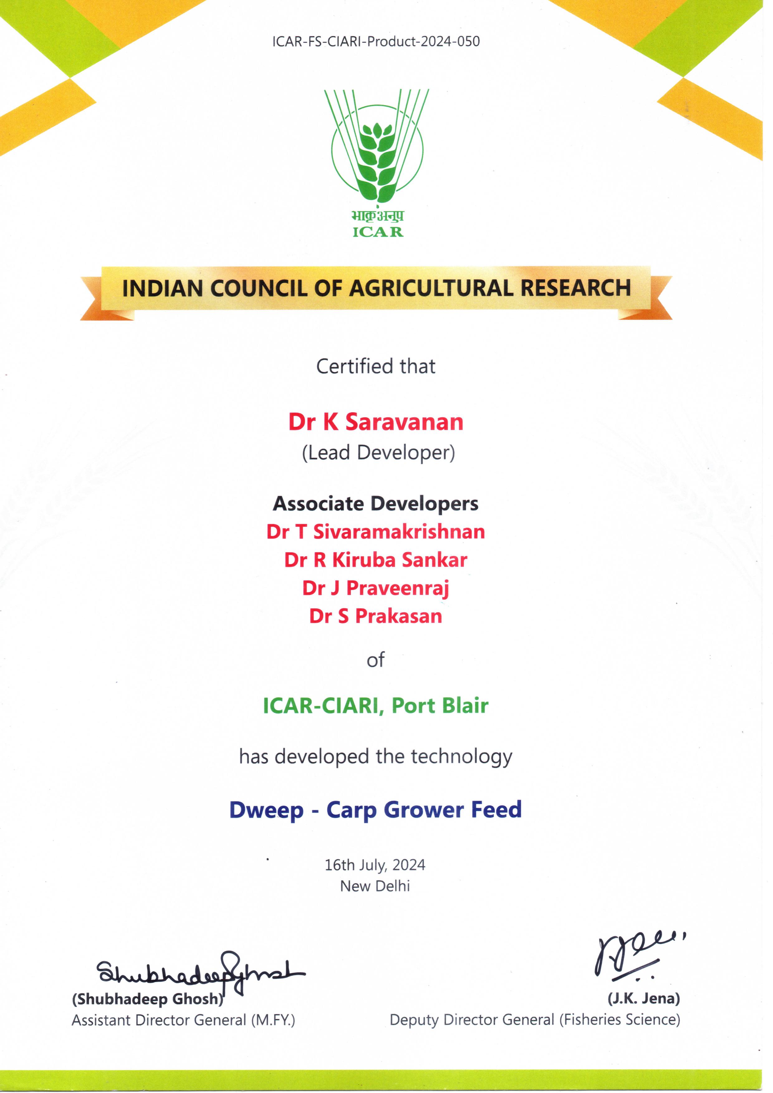 ICAR-CIARI commercialises Dweep-Carp Grower Feed Technology