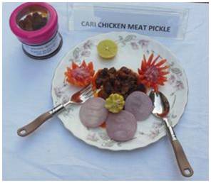 Prepared as a value addition to the meat of spent hen. Spent hen was slaughtered at the age of 60 weeks and approximately 500 gm meat could be dissected out from each bird. The meat was cut into optimum sized and marinated with turmeric and salt and sun dried for 10 12 hours to reduce the moisture content. A value added product of spent meat. Apart from other recipes of chicken meat this pickle can also be used.