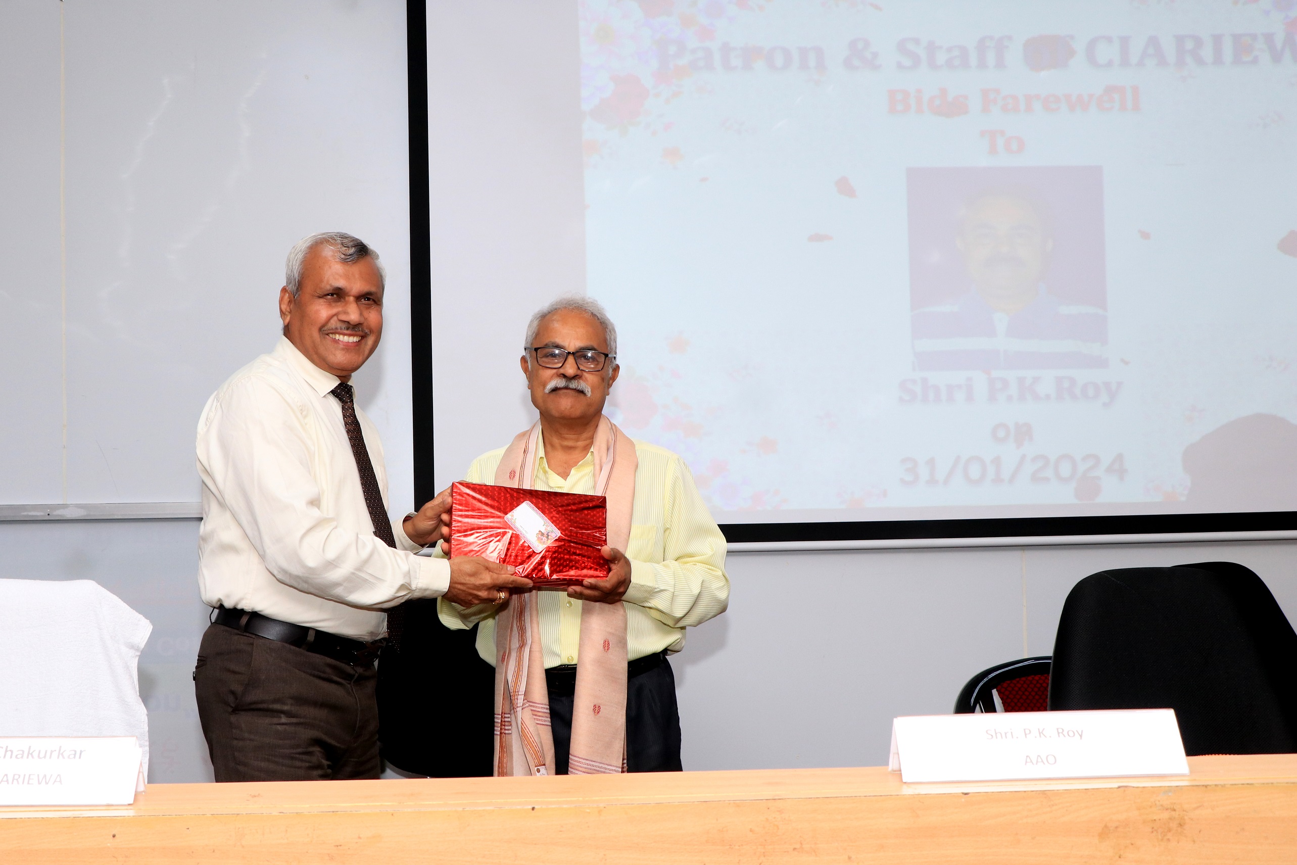 Dr. Eaknath B. Chakurkar, Director and Patron, CIARIEWA in his presidential address expressed placed on record the seminal services of Shri P.K. Roy, AAO. He suggested to spend quality time by exercising his talent towards practicing yoga, healthy lifestyle, income tax consultant etc. and be active in his new area of service. He concluded his speech by asking him to teach the juniors on the nitty gritty of office procedure for enhancing the work performance. He was honoured with a shawl and memento by the Patron, CIARIEWA on the occasion.