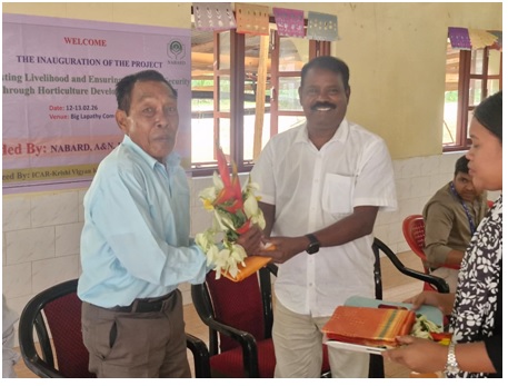 The inauguration programme of the project titled “Boosting Livelihood and Ensuring Nutritional Security Through Horticulture Development in Nicobar” was successfully conducted on 12 February 2026 at Community hall, big lapathy village. The programme marked a significant step towards strengthening horticultural development and improving the livelihood and nutritional security of the farming community in Nicobar district. The programme was inaugurated by LionadNicomed, CTC, Car Nicobar, and First Village Captain, Shri Manuah Thomas in the distinguished presence of Shri Gopalan Santhanam, General Manager, NABARD, Shri Praphul Dev, Assistant Manager, NABARD, and Dr. Santosh Kumar, Head, KVK Nicobar. The programme commenced with a welcome address by Dr. Santosh Kumar, Head, KVK Nicobar, who warmly welcomed all the dignitaries, farmers, officials, and participants. He briefed the gathering about the objectives and importance of the project for the Nicobar region, emphasizing the need for horticulture development to enhance farmers’ income, create sustainable livelihood opportunities, and ensure year-round availability of fresh and nutritious vegetables and fruits. He highlighted that the project focuses on capacity building, supply of quality planting materials, technical guidance, and promotion of scientific horticultural practices suited to local conditions. In his inaugural address, LionadNicomed, CTC, Car Nicobar, encouraged farmers to actively participate in vegetable cultivation and horticultural activities. He stressed the importance of increasing local vegetable production to ensure nutritional security for island communities and reduce dependency on external sources. He motivated farmers to adopt improved practices and work collectively for the success of the project. Big Lapathy Captain, Shri Manuah Thomas, also addressed the participants. He appreciated the initiative taken by NABARD and KVK Nicobar for implementing the project in the region. He encouraged farmers and village members to actively support and participate in horticulture activities to strengthen local food production and improve community well-being. He emphasized unity and collective effort for achieving long-term benefits under the project. Shri Gopalan Santhanam, General Manager, NABARD, addressed the participants and elaborated on NABARD’s role in promoting rural development and livelihood enhancement. He explained the objectives and key components of the project and assured continued institutional support for strengthening horticulture development in Nicobar. He encouraged farmers to make effective use of the technical and financial assistance provided under the programme. The programme concluded with a vote of thanks, expressing sincere gratitude to all dignitaries, village leaders, officials, farmers, and organizers for their valuable presence and support in making the inauguration programme a grand success. This programme conducted under the guidance of Dr. Jai Sunder, Director(Act), ICAR-CIARI, Sri Vijaya Puram.