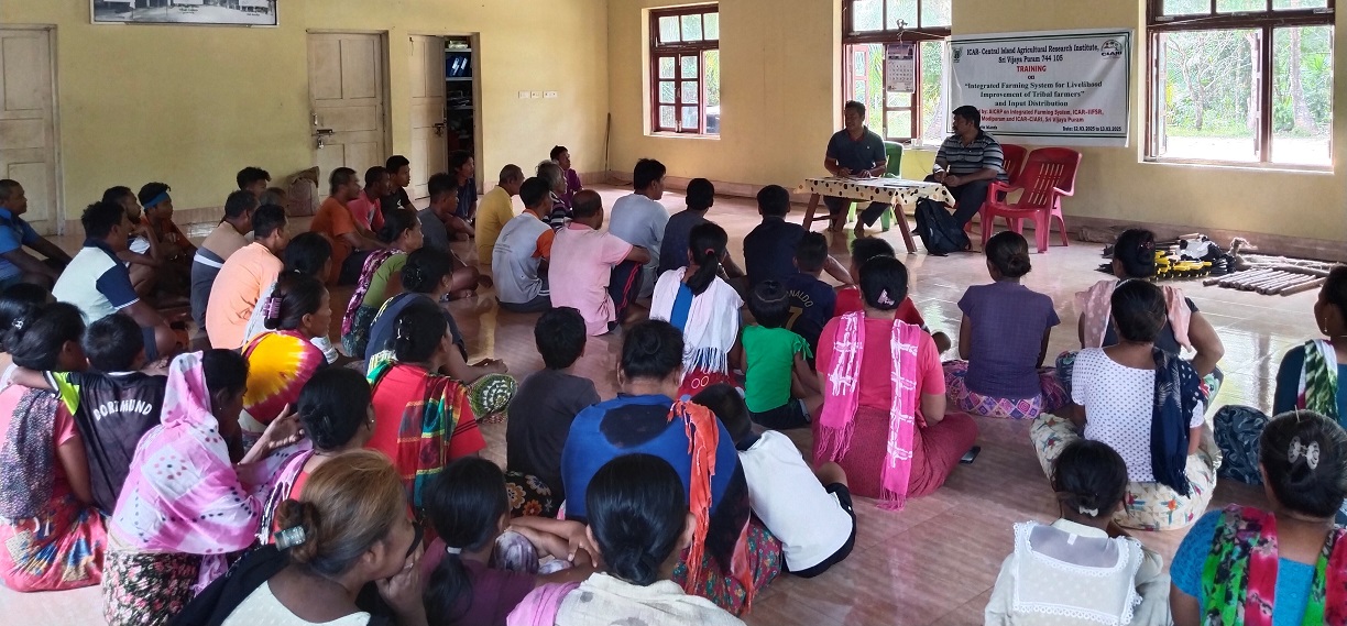 A twin programme on the Integrated Farming System for Livelihood Improvement of Tribal Farmers and Agro-Advisory Services for Livelihood Improvement of Farmers under the STC was conducted by the AICRP on the Integrated Farming System in collaboration with Gramin Krishi Mausam Seva. As part of the programme, small agricultural implements were distributed by ICAR-Central Island Agricultural Research Institute in coordination with the Zonal Agricultural Office, Nancowrie, across four villages; Kakana, Pilpillow, Chotta Enaka, and Hitui on 12th and 13th March 2025. During the programme, Dr. I. Jaisankar, Senior Scientist (Agroforestry) and Principal Investigator of the All India Coordinated Research Project on Integrated Farming System, elaborated on the advantages and scope of the Integrated Farming System, including the incorporation of various components to enhance farm income. He discussed tuber crops, fish, poultry, and cattle integration, waste recycling, the cultivation of multipurpose tree species, CIARI technologies, organic waste management, and integrated pest and disease management within the system.
