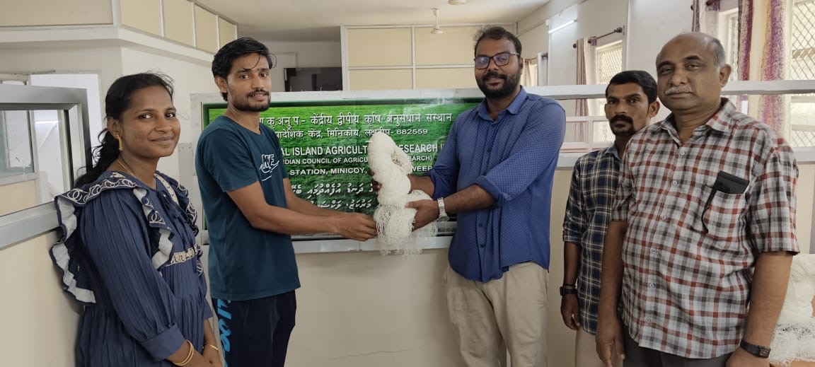 Dr. V.M. Abdul Gafoor, SMS, ICAR-KVK, Kavaratti, expressed his happiness with the activities of the Regional Station of ICAR-CIARI. He interacted with the farmers and shared his experience with the IFS (Integrated Farming System) incorporated with good and efficient livestock breeds. Dr. Ajina S. M. and Dr. Gladston Y., interacted with farmers on natural farming, organic farming, integrated farming systems, integrated pest management, and disseminated knowledge on how to initiate scientific farming practices in agriculture and allied sectors. Later, they visited the three islands of Lakshadweep and interacted with fishers on the aspects of responsible fisheries, community-based resource management, diversified fishing practices, and the role of FAD and disseminated knowledge on how to initiate sustainable fishing practices in pole and fisheries. The team also visited various fish landing sites, interacted with the fishermen and imparted hands on training on cast net operation.Farmers were also trained to prepare fish amino acid and bio slurry preparations. Shri. Arif M.I., Senior Technician, demonstrated fruit fly traps and mentioned their importance in integrated pest management.