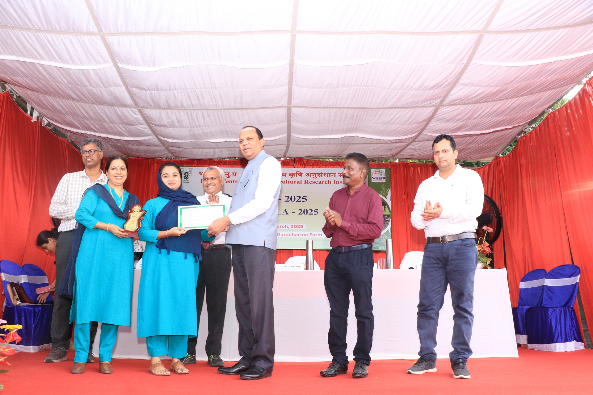 Dr. S.K. Chaudhary, Director General of the Fertilizer Association of India and former Deputy Director General of Natural Resource Management at ICAR, New Delhi, was the Chief Guest. In his address, he expressed his satisfaction with the positive feedback from numerous farmers eager to acquire new knowledge and skills for their agricultural practices. He emphasized that all scientists at the Institute and KVK are committed to transferring innovative technologies and methodologies to the farming community. Dr. Chaudhary encouraged the farmers to share the knowledge gained from the Kisan Mela with their fellow farmers in their villages.He was particularly pleased with the number of awards received by young individuals and students, noting that at a time when many from the younger generation are moving away from agriculture, such recognition could inspire them to return to the field and pursue careers as entrepreneurs and scientists. He highlighted that adopting techniques such as organic farming, drone technology, information technology, and farm mechanization could significantly enhance agricultural productivity.Furthermore, he advised farmers to leverage the support provided by the scientists at the Institute and KVK to independently advance their cultivation practices using modern technologies. He also urged them to explore agro-eco tourism by integrating various elements such as crops, livestock, culture, heritage, and flowers to attract tourists..