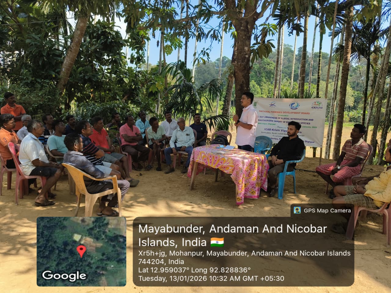 ICAR–KVK, North & Middle Andaman successfully organized an awareness programme on Illegal Introduction and Unauthorised Import of Exotic Fish Species” on 13thJanuary, 2026 at Mohanpur, Diglipur Tehsil. The programme was designed to address local fish farmers, fishery stakeholders and community members about the risks associated with bringing in or releasing non-native fish species into local waters bodies.
