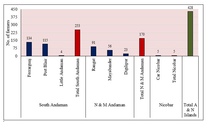 The research output and proven technologies are disseminated to farmers through various extension activities viz. capacity building programmes, trainings, demonstrations, field days, kisan mela, awareness programme, commercialization. A study conducted to assess the extent of adoption of CIARI technologies among the farmers of Andaman & Nicobar Islands since 2017 revealed that, 59 potential CIARI technologies comprising Horticulture, Crop Science, Fisheries, Animal Science and Natural Resource Management have been adopted by 428 farmers across the three districts of Andaman and Nicobar Islands. Among them, 59.11% of the beneficiaries were from South Andaman, followed by N&M Andaman (39.72%) and Nicobar (1.17%). The highest adoption of technology was in Ferrargunj Tehsil (134 farmers) followed by Port Blair (150 farmers) and Rangat (91 farmers). The highest number of farmers adopted scientific goat farming (143 farmers), Scientific pig management (84 farmers), Mini incubator (49), Tri-Model therapy for Humpsore (42 farmers) followed by black pepper cultivation in arecanut, blood fruit cultivation, roof-top gardening, CIARI Dhan 5, CIARI Mung 1, CIARI Urd 1, Vermicompost, Homestead IFS and carp feed. |