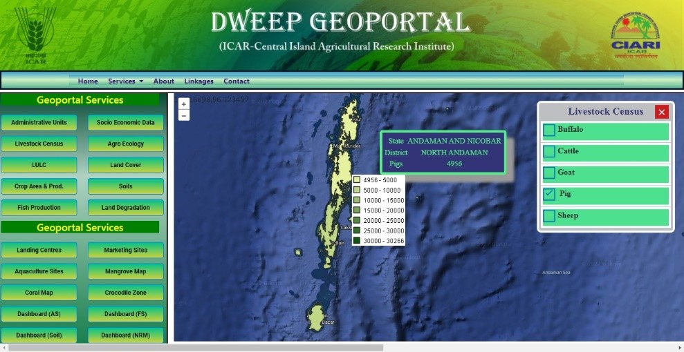 | ICAR-Central Island Agricultural Research Institute has initiated to develop dedicated Dweep Geoportal to systematically organize and deploy agriculture and allied information in Geographic Information System (GIS). The user interface of dweep Geo-portal was developed using web technologies i.e. HTML, CSS and JavaScript to visualize various point, line and polygon thematic layers on administrative layers (District Boundary, Block Boundary, Socio Economic Data, Demographic information, Land use land cover, Natural resources: Soils, water, etc., Climate and weather, Watershed map, Crop, Livestock and Fisheries data. Spatial layers on Island resources were deployed and provided as Web Mapping Services (WMS) by using the Geoserver platform By hosting GeoServer on Tomcat Web Server. Open Layers, a free mapping library, is integrated into GeoServer to display variety of maps to the user. These layers were stored in PostgreSQL database. All open source Web-GIS tools GeoServer, PostgreSQL and OpenLayers were installed in the local server. |