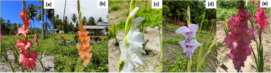 Butter fly type varieties of gladiolus flowers (a) Friendship, (b) Spic and Span, (c) White friendship, (d) Violet and (e) Pink Field day on Gladiolus cultivation under coconut shade |