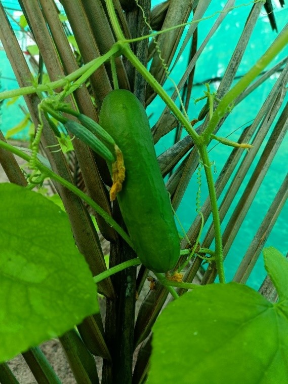 The parthnocarpic hybrid seeds of salad cucumber, KAU variety “Heera” was tested in the demonstration field of ICAR- CIARI, Minicoy under semi protected structure and performance were evaluated. The variety performed well in the cultivation system. The pits were made with the dimension of 60X60X100 cm and filled with cow dung manure of 2 kg/ pit, and organic micro nutrients (500g/pit).Two seedlings were planted in each pit of distance 50 cm apart. Good flowering and fruit set were observed in the plants. Due to the heavy fruit fly attack the yield got affected. A fully protected system with fruit fly trap were planned for the future. The yield was 0.5kg/per Sq.m.