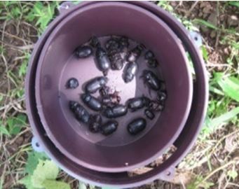 The management of Rhinoceros beetle by baculovirus is a land mark success in biological control. The baculovirus infests both the grubs and adults of the beetles. The virus is released in the field by infected beetles. Beetles can be collected in large numbers manually from breeding grounds or by deploying the same RB pheromone traps. A diseased grub is macerated in 100 ml clean water containing 5 gm sugar, the suspension is taken in shallow container and the collected beetles are allowed to wade in that for about half an hour. The healthy beetles during this period take up the virus inoculums and get infected. The beetles are later confined in saw dust overnight. The next day at dusk the beetles visiting breeding sites pass on the infection to both larvae and adults. The transmission is by contamination with healthy partner.
