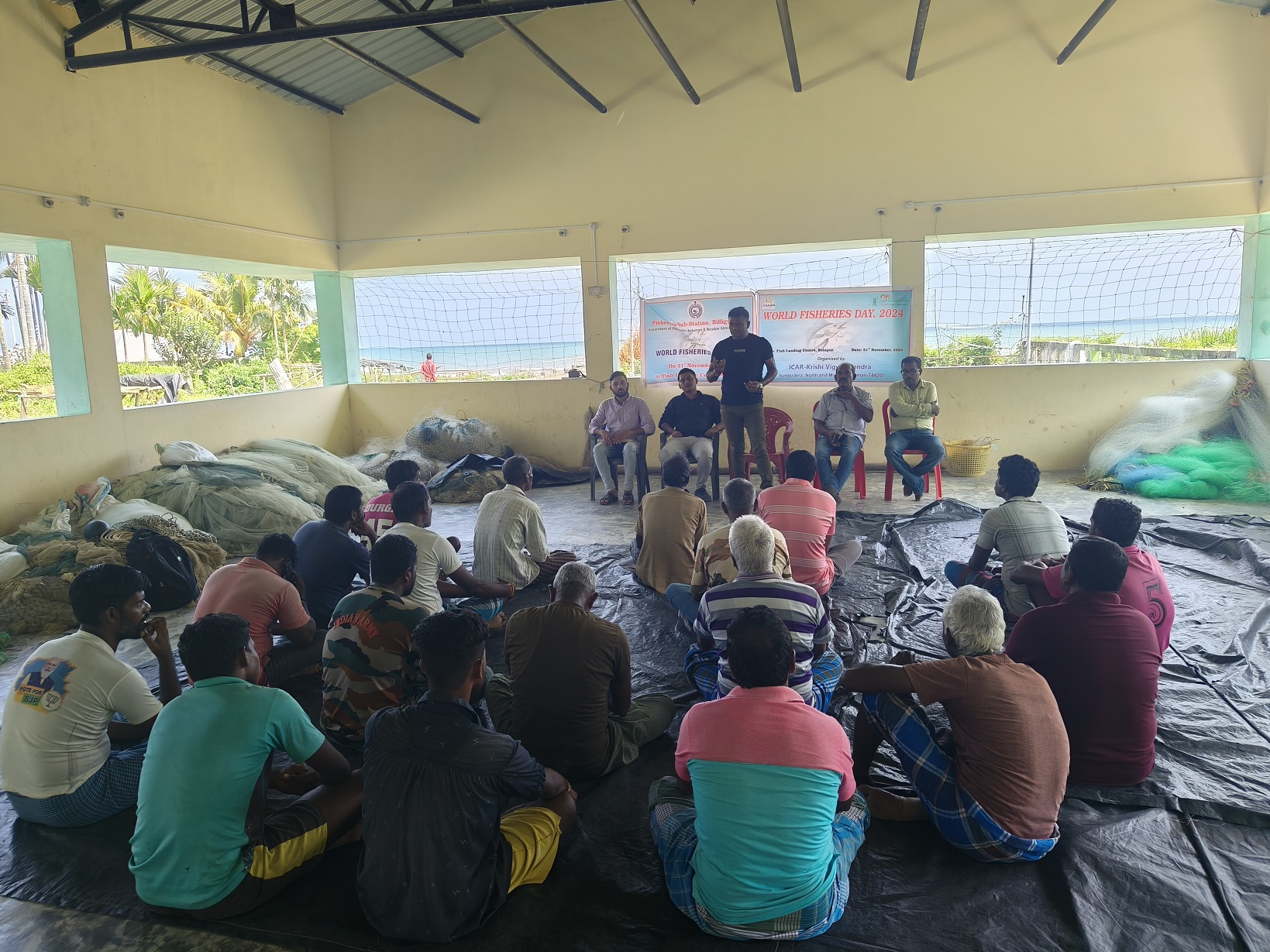 The ICAR-Krishi Vigyan Kendra (KVK), North & Middle Andaman, celebrated World Fisheries Day on November 21st, 2024, at the Fish Landing Centre, Betapur in collaboration with Department of Fisheries, Fisheries Substation, Billiground. The program focused on the critical importance of sustainable fisheries, conservation of aquatic ecosystems, and safeguarding the livelihoods of fishing communities. The program was inaugurated by Mr. Tapan Kumar Biswas, Assistant Director of Fisheries, North & Middle Andaman district. In his inaugural address, he emphasized the significance of World Fisheries Day in promoting sustainable fisheries and acknowledged the pivotal role of the fishing community in food security. He also encouraged the fishermen to utilize various schemes such as the Pradhan Mantri Matsya Sampada Yojana to improve their livelihoods and adopt sustainable practices, fostering long-term growth and resilience in the fisheries sector. Mr. Subam Debroy, SMS (Fisheries Science), emphasized the need for adopting eco-friendly fishing practices to curb the overexploitation of marine ecosystems and maintain ecological balance. He stressed the importance of adhering to appropriate mesh size regulations and observing fishing bans during the monsoon season to give fish the opportunity to breed at least once in their lifetime, ensuring the sustainability of marine resources. Furthermore, he highlighted the significance of prioritizing aquaculture as a sustainable and scalable solution to address the growing global demand for food while reducing pressure on natural fish stocks. Mr. Rakesh Dawar, SMS (Agronomy), emphasized the significance of World Fisheries Day in raising awareness about sustainable fisheries management. He urged fishermen to leverage resources and opportunities provided by the dedicated fisheries ministry to improve their livelihoods. Mr. Yatharth Sharma, SMS (Home Science), discussed the critical aspects of post-harvest processing and value addition in the fisheries sector. Earlier, Mr. Sanjib Kumar Sutradhar, Fisheries Inspector (Billiground substation) welcomed the participants and provided an overview of the program.The program was organized under the overall guidance of Dr .Eaknath B. Chakurkar, Director of ICAR-CIARI, Sri Vijayapuram. About 22Fisherman participated and benefited from the program.