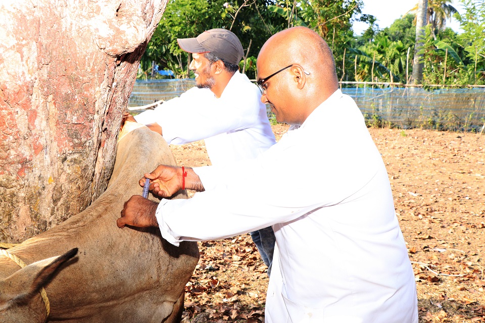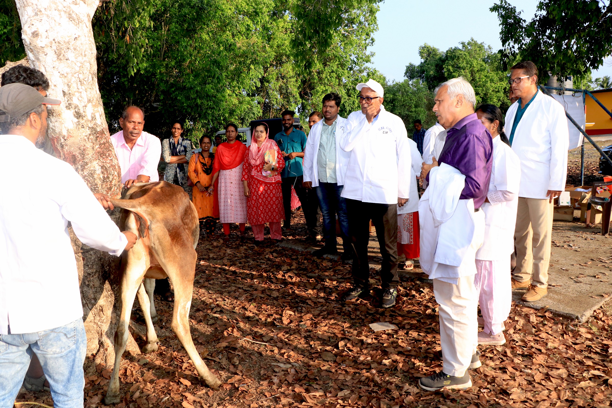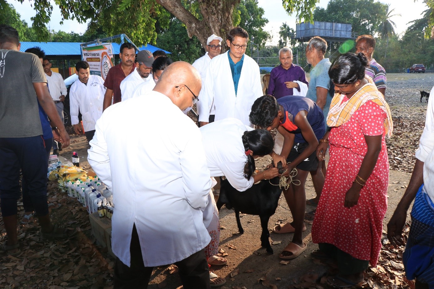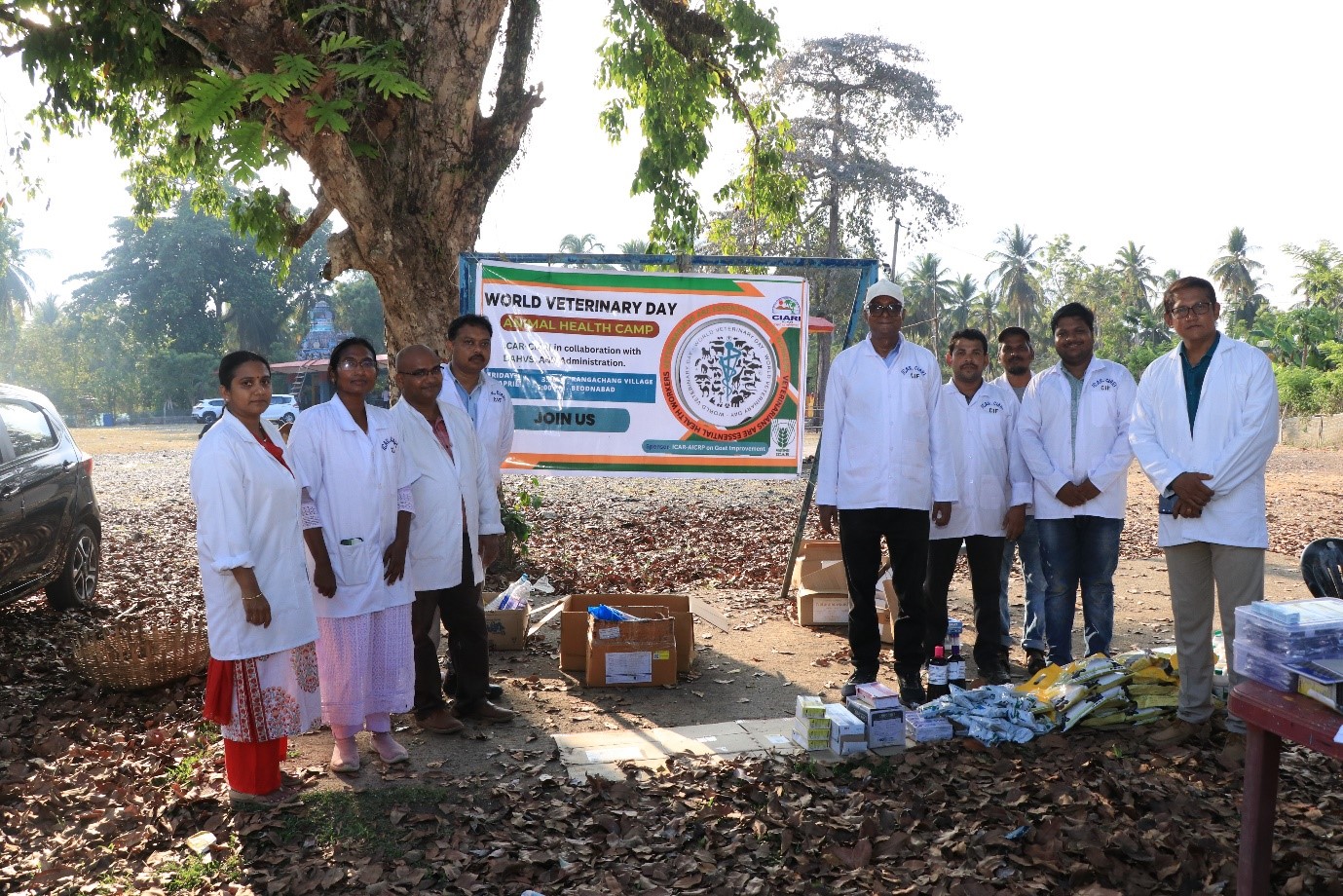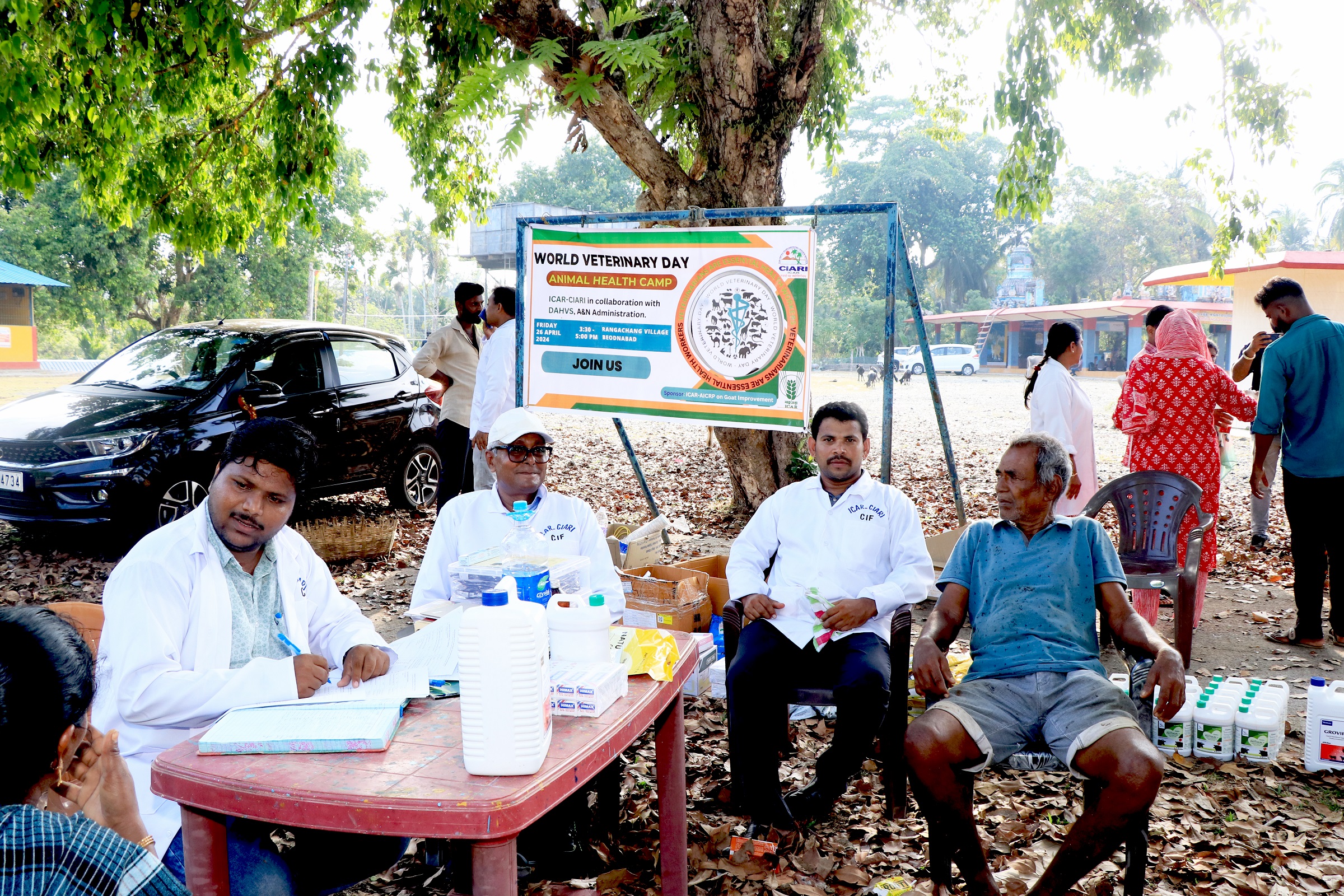 In observance of World Veterinary Day, the Division of Animal Sciences, ICAR-CIARI, in collaboration with the DAHVS, A&N Administration, conducted an animal health camp at Ranganchang village, Boednabad Panchayat, on April 26, 2024. The theme of World Veterinary Day for this year is “Veterinarians are Essential Health Workers," which highlights the critical role veterinarians play not only in animal health but also in preventing zoonotic diseases. The camp encompassed the examination of animals for general health check-ups, fertility evaluations, pregnancy diagnosis, mass deworming, and vitamin and mineral supplementation. More than 100 animals, including cattle, goats, and poultry, were attended to and provided with appropriate veterinary care. On the occasion, Dr. E.B. Chakurkar, Director, ICAR-CIARI, briefed about scientific management practices, timely deworming, feeding, and reproductive management. He appreciated the effort of the scientists of ICAR-CIARI and Dr. T.P. Swapna, Sr. Veterinary Officer, Rangachang, and suggested to conduct regular animal health camps in the future as well. Dr. Jai Sunder, Head, Division of Animal Science, emphasized the health management of the livestock, particularly the regular use of vaccinations against foot and mouth disease. Dr. D. Bhattacharya, Dr. T. Sujatha, Dr. P.A. Bala, Dr. K. Muniswamy, Dr. R.R. Alyethodi, Dr. P. Perumal, and Dr. S. Yeligar also attended the animals brought for checkup and addressed the various issues of scientific management practices. Mineral mixtures, vitamin tonics, and deworming medicines were given to all the farmers. Farmers of Rangachang village extended their gratitude to ICAR-CIARI and DAHVS for their efforts in organising the initiative and providing invaluable support.