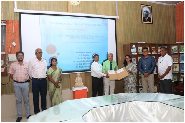 ICAR-Central Island Agricultural Research Institute (ICAR-CIARI), Sri Vijaya Puram, signed a Memorandum of Understanding (MoU) on December 17, 2024, for licensing DweepTickure—a herbal acaricide formulation developed for the control of ticks in livestock. The agreement was signed by Dr. E.B. Chakurkar, Director of ICAR-CIARI, and Smti M.K. Kamala, CEO of Panchajanya Enterprises, Bengaluru, at ICAR-CIARI, Sri Vijaya Puram.A team comprising Dr. T. Sujatha, Dr. Jai Sunder, Dr. D. Bhattacharya, Dr. E.B. Chakurkar, and Dr. A.K. De developed the formulation. DweepTickure is an eco-friendly, non-toxic herbal product designed to treat tick infestations in livestock. The formulation includes herbal extracts in herbal oil, which effectively kills ticks and repels flies from domestic animals.This patented technology has significant potential as part of an Integrated Pest Management (IPM) strategy, offering sustainable benefits for improving the health of cattle and goats.