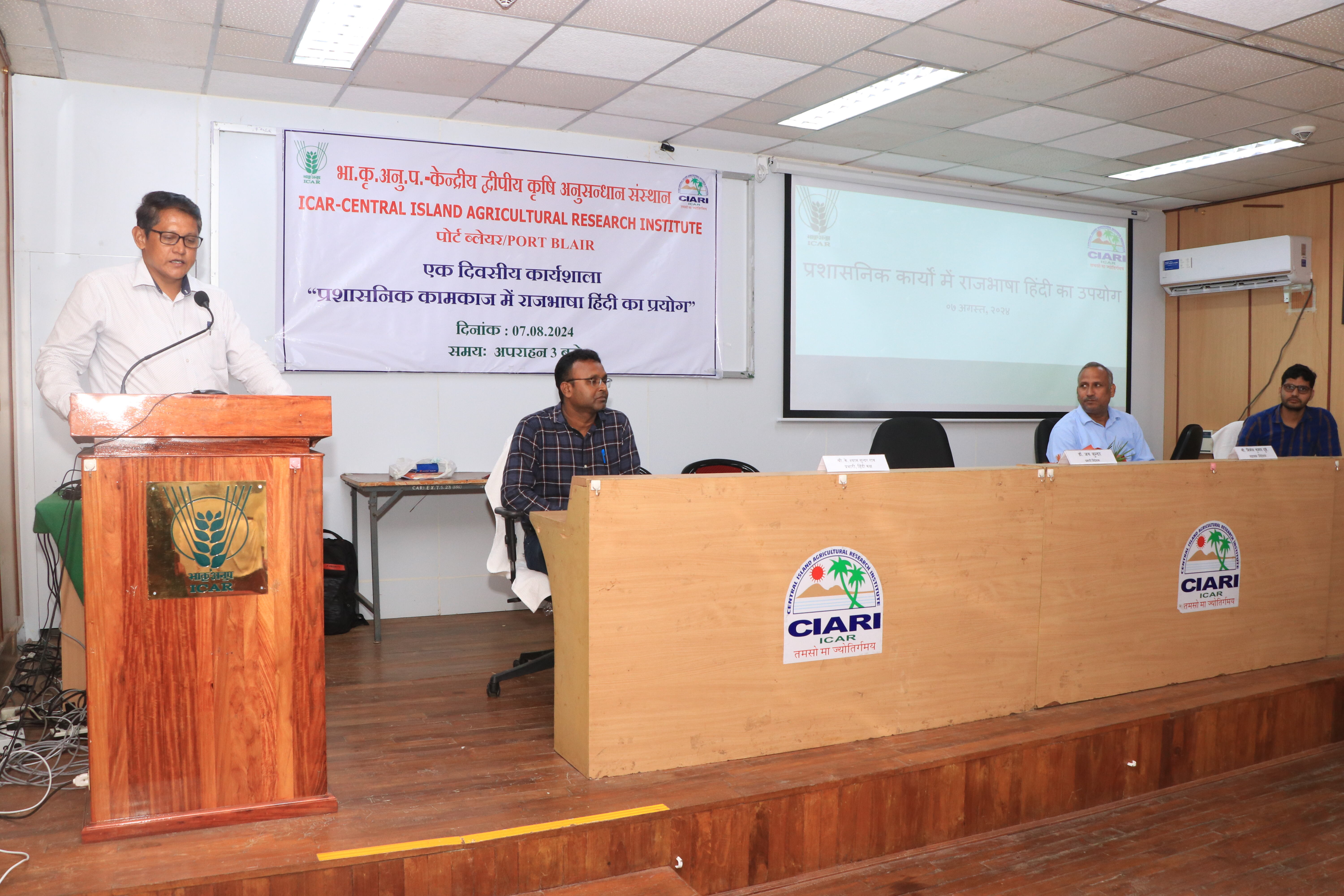 ICAR- CIARI, Port Blair conducted a workshop on "Application of Rajbhasha Hindi in administrative works" on 07.08.2024 at Dr. T. R. Dutta Conference Hall. On this occasion, Shri. Nirmal Kumar Dubey, Assistant Director & Head of Office, Regional Implementation Office (Eastern region), Kolkata graced as a chief guest. Dr. Jai Sunder, Director I/c presided over the function. Chief guest stressed on the use of rajbhasha in the day to day office work. He delivered a talk on “Mental barrier towards official language Hindi" and highlighted the history and importance of Hindi language Nationally and Internationally for making India united and strengthen. Shri. Kanisk Bhukar, Administrative Officer presented a talk on "use of rajbhasha Hindi in administrative works while dealing of e-files and other software's". In his address, Dr Jai Sunder appreciated the programme and highlighted the need and importance of Hindi as a Rajbhasha for effective administrative and extension works of ICAR-CIARI and emphasized to conduct more workshops in various topics for betterment of entire scientific, technical and administrative fraternity. The programme was coordinated by Shri. Shyam Sundar Rao, Hindi Cell I/c. A total of 45 participants, comprising of scientists, technical, administrative, supporting staff attended the programme.