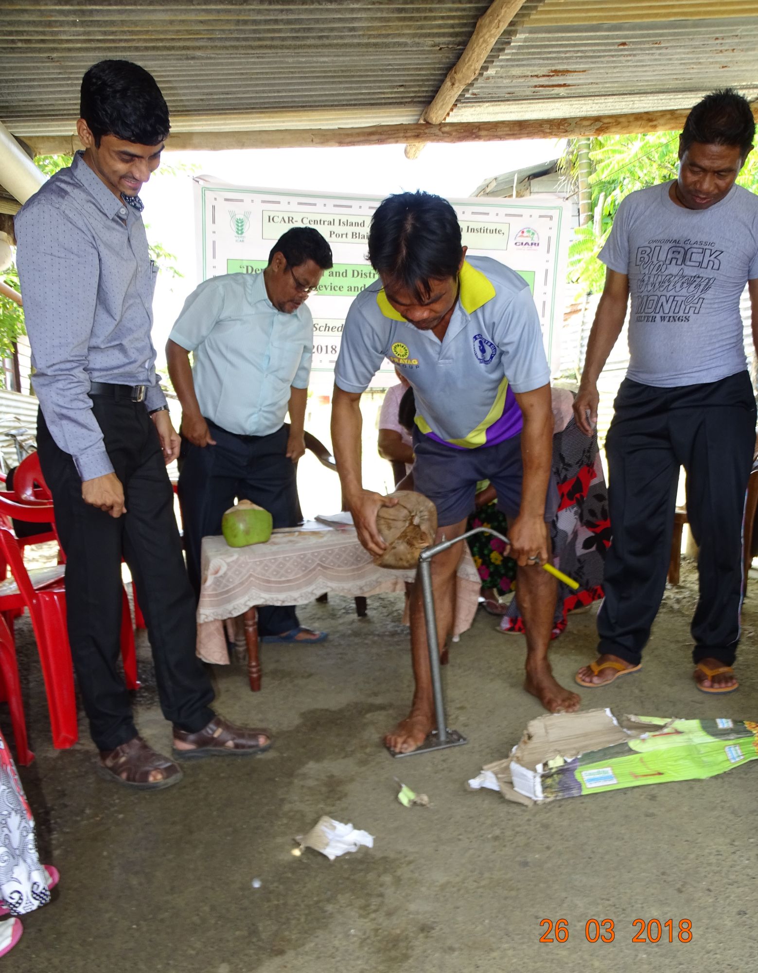 Coconut is indispensible in day to day life of Nicobarese tribe of Andaman and Nicobar Islands. Coconut kernel and oil are mainly used in several culinary preparations of tribal people, while tender coconut is also relished by them. However, systematic coconut farming is rarely adopted by the tribal communities and many a times, only fallen nuts are collected. Except for occasional harvesting of nuts from the palms, no intercultural operations are generally adopted by the community. Nicobarese pigs, which are the symbol of prosperity among the Nicobarese tribals, are also found to relish coconuts here. The tribal people also use coconuts to feed the pigs. Traditionally, nuts are harvested by climbing on the palm, followed by manual dehusking using the pointed tool. Coconut dehusking is generally undertaken by tribal men using locally made tools and women are rarely involved in this activity. These operations were causing lot of drudgery to these tribal farmers.